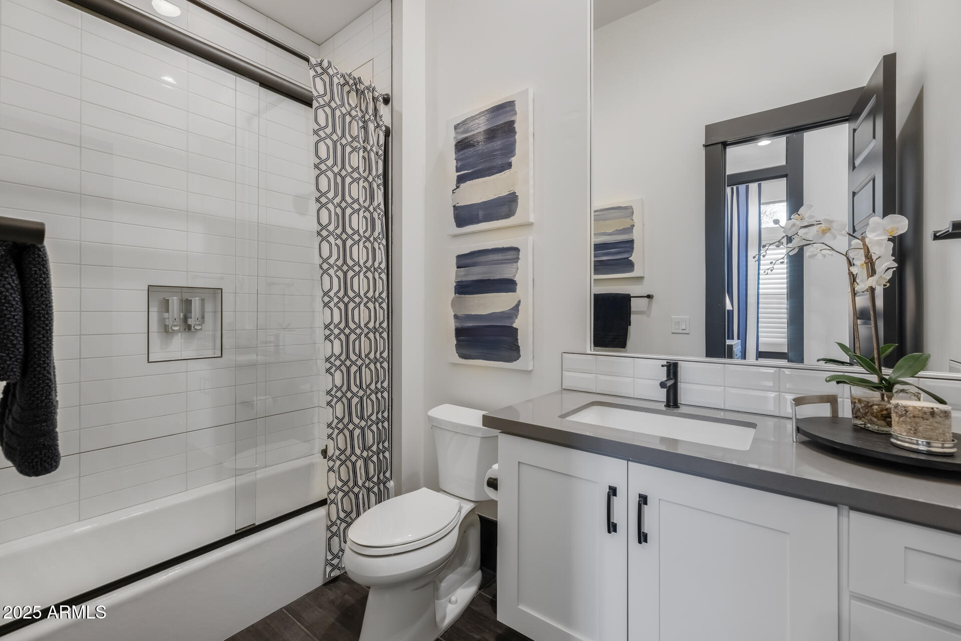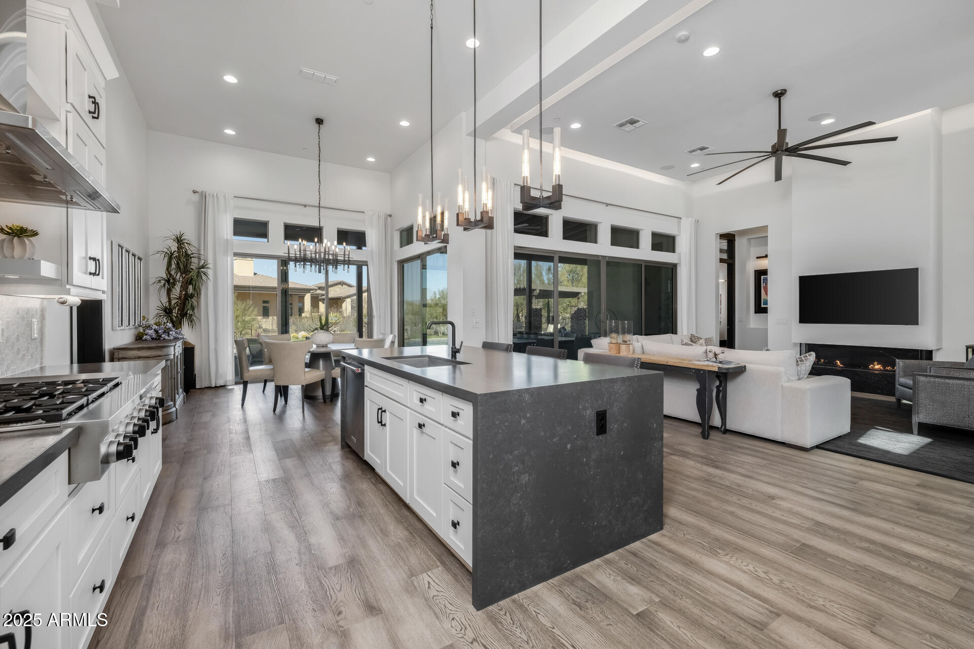 Welcome to this stunning former model home with modern designer finishes throughout. This home features 3 bedrooms,3 bathrooms, an office, a gourmet kitchen, and a resort style backyard. The great room captivates with its tray ceilings, sleek modern fixtures, abundant natural light, immersive surround sound, and a charming built-in 3-sided fireplace. The gourmet kitchen stands out with a waterfall breakfast bar island, high-end stainless-steel appliances, double ovens, a pot filler, and a built-in refrigerator. The primary suite is a true retreat, offering surround sound, a sliding glass door to the backyard, shutters, and a spa-like ensuite with dual vanities, under-cabinet lighting, and a huge walk-in shower complete with a soaking tub. The oversized walk-in closet includes built-in drawers and shelves. Bedrooms 2 and 3 are move-in ready with shutters and walk-in closets. The front bedroom has a private ensuite! The laundry room is fully equipped with cabinetry and a sink, while the garage offers storage and epoxy flooring. Step into your private backyard oasis, where every detail is designed for relaxation and enjoyment. An expansive covered patio provides the perfect space to unwind, complemented by a built-in BBQ and a pergola overlooking the heated pool with tranquil waterfalls. The Sonoran-inspired landscape adds natural beauty, while critter fencing ensures both comfort and peace of mind in this thoughtfully designed outdoor retreat. Do not miss out on this luxurious home.