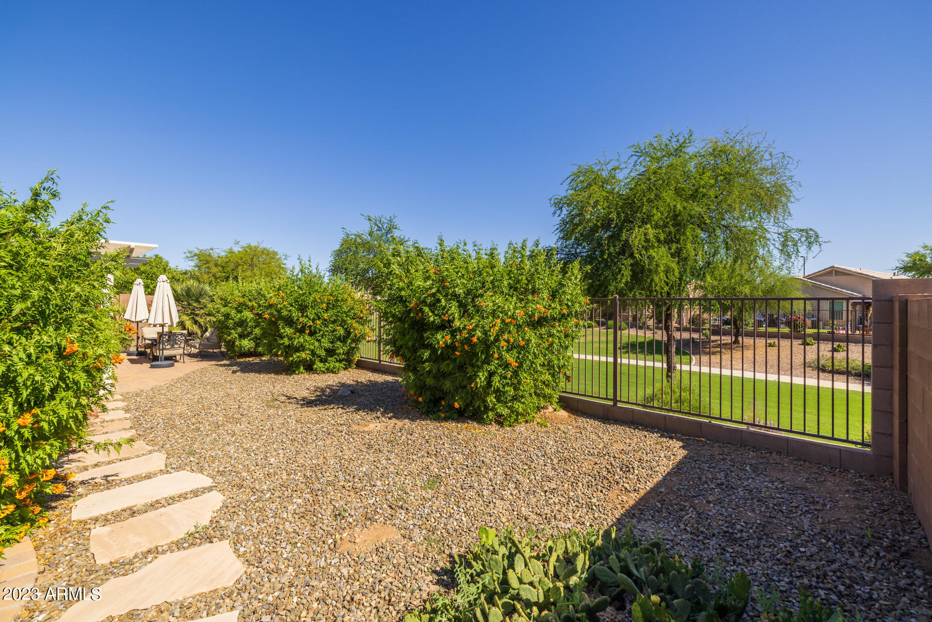 Gorgeous single-story home in the desirable Adora Trails community, offering 4 bedroom & 3 bathroom with a 3 car tandem garage! This open floorplan has a spacious great room with a lot of natural light and a ceiling fan. The kitchen has beautiful 36'' cabinets with a decorative glass cabinet insert, a huge kitchen island with a breakfast bar, a walk-in pantry plus a butler's pantry off the garage, stainless steel appliances, and a stunning pendant light fixture over the dining room table. This bright and airy home is neutral toned throughout and move-in ready! The primary suite is spotless with a luxurious ensuite bathroom featuring a walk-in shower, dual sink vanity and a walk-in closet. The remaining bedrooms are spacious with ceiling fans. The backyard has a pergola built off the covered patio and pavers extended out to a seating area with lush trees. Enjoy no neighbors behind you, the home is backed up to a community green belt. Other features include a reverse osmosis system, soft water and loop, large laundry room with shelves, and an RV gate! Located in a highly rated Chandler school district! Do not miss this opportunity to own a home in this prime location of Gilbert. Schedule your showing today.