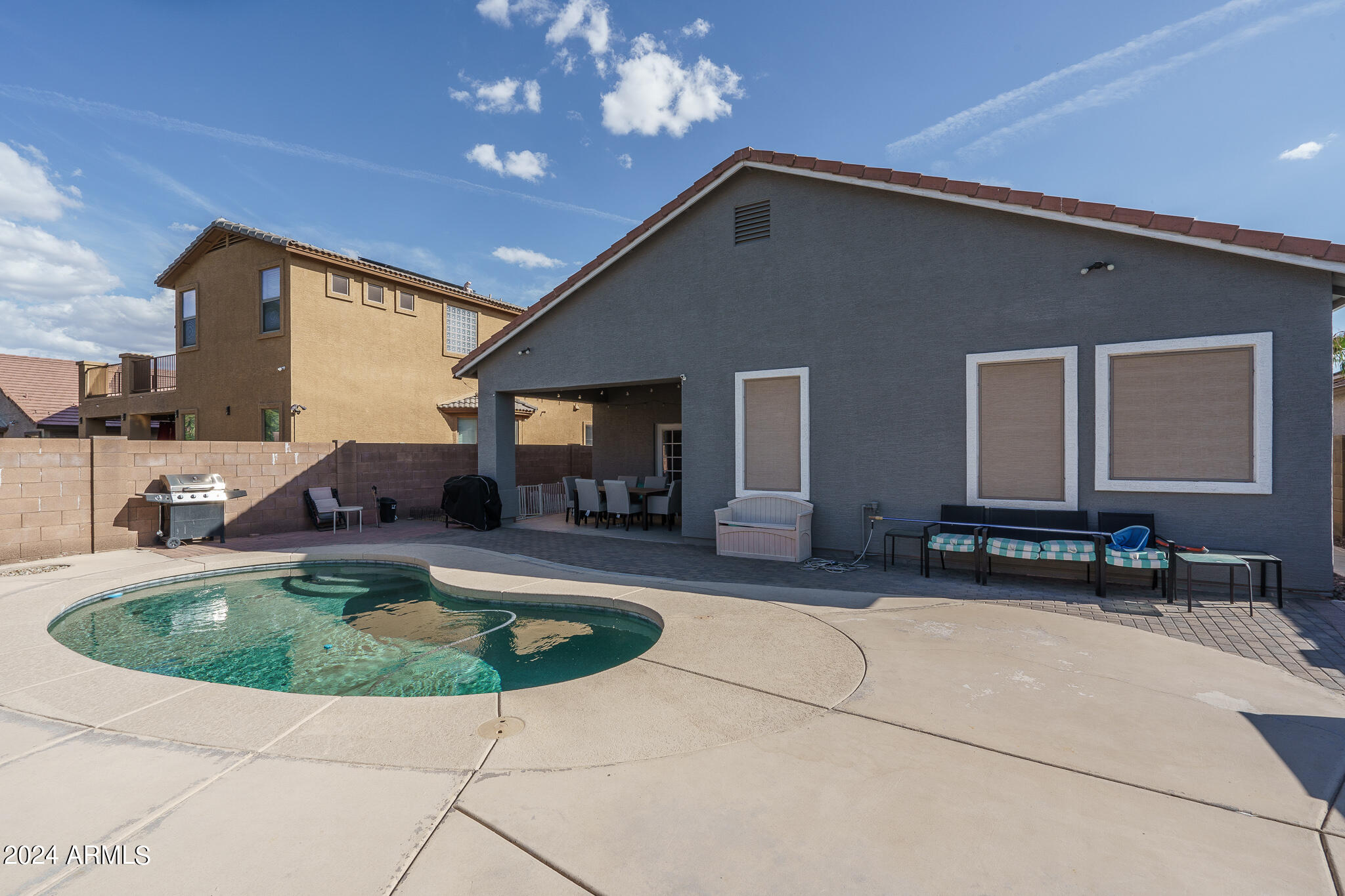 Amazing backyard & pool!, New AC in 2022! 3 bedrooms, a den, 2 bathrooms, and remodeled throughout. The kitchen has been remodeled and increased the size neutral cabinetry with crown molding, tile backsplash, Quartz countertops, stainless steel appliances, and a kitchen island with a breakfast bar. New flooring, kitchen R/O. The great room has surround sound and French doors that open up to the refreshing backyard and patio! The primary suite is bright with a door to the patio, and ensuite bathroom featuring a soaking tub and dual sink vanity. Bedrooms 2 and 3 are move-in ready with binds and ceiling fans. Plus, a large den perfect for a hobby room! The backyard has a refreshing pebble tec pool and a large covered patio with a ceiling fan, keeping you cool in the summer. Additional features include sunscreens on windows, storage in the garage, and cabinets in the laundry room! Do not miss out on this beautiful home!