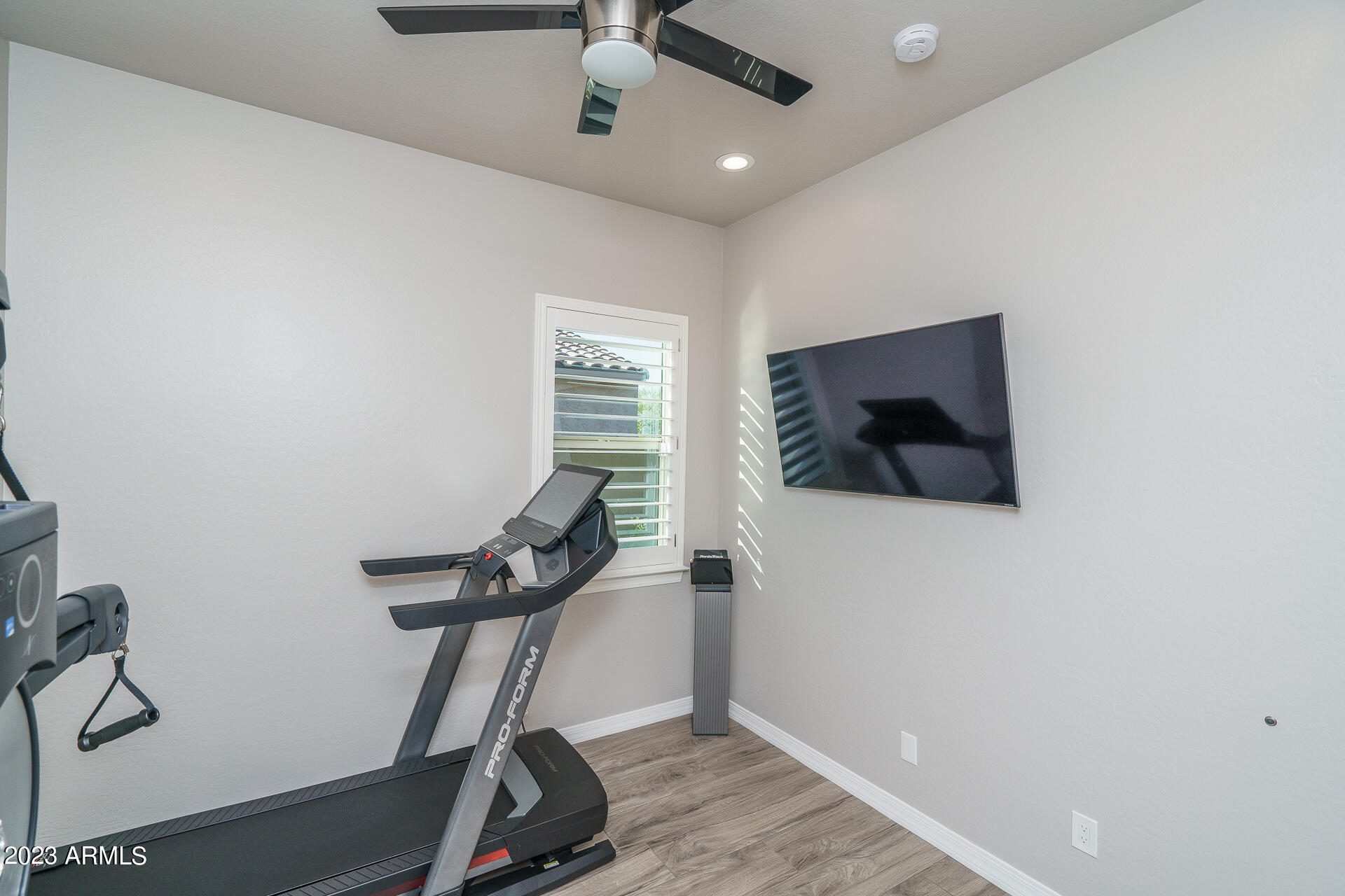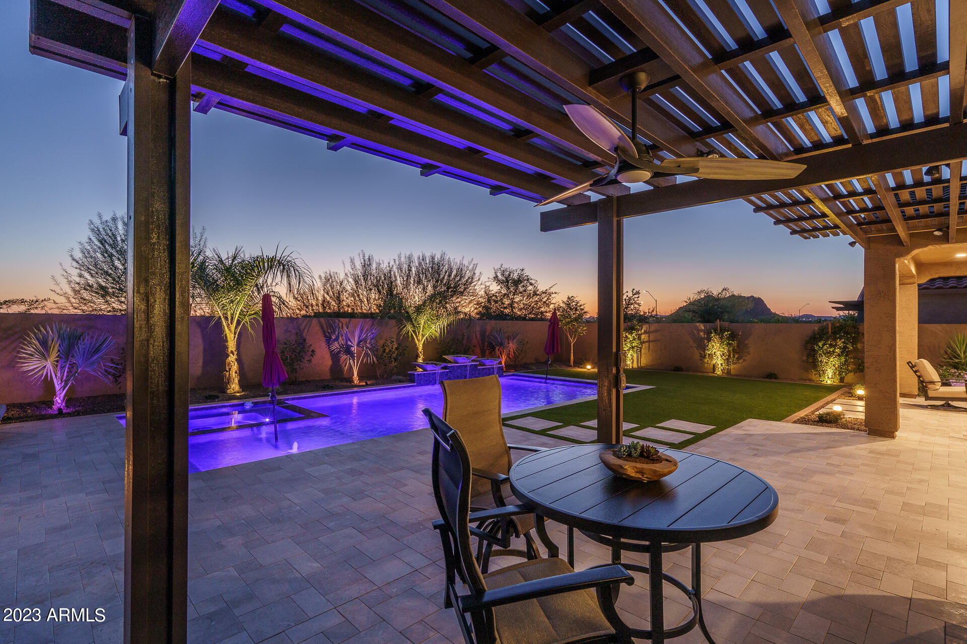 Experience true luxury living in this single-story home in Querencia, a desirable gated community in Peoria! This home is stunning inside and out with a welcoming exterior and a resort-style backyard offering 2,323 sq ft of living space. The driveway is extended with pavers, RV gate, and a security door. This home was built for entertaining; the great room is spacious with a multi-panel sliding glass door offering a spectacular view of the backyard. The entire home is in immaculate condition with true pride of ownership, gray neutral tones are a perfect compliment to the white cabinets and shutters, no detail was overlooked when designing this home! The gourmet kitchen features Wolf appliances, a pot filler, gorgeous Quartz countertops, a built-in wine fridge, 42'' white shaker cabinets with soft-close, walk-in pantry, and a large kitchen island with a breakfast bar. Escape to the primary suite offering private patio access with a large sliding door. The luxurious ensuite bathroom boasts a huge walk-in closet finished with built-in cabinets and shelves, dual sink vanity with quartz countertops, and a tiled shower. Unwind after a long day with this private Arizona oasis, the covered patio is extended with recessed canned lights, a ceiling fan, and upgraded patio tile floors. Plus, an additional pergola with a fan! The backyard is a masterpiece boasting a custom heated pool/spa and a serene water feature. Enhancing the tranquil ambiance of this outdoor space are perfectly placed trees along the fence line with showcase lighting. Bedroom 2 and 3 are pristine with walk-in closets, the den is a perfect space for an office or flex room! The laundry room has upper and lower cabinets with a built-in utility sink, quartz countertops, and a tile backsplash. The garage has epoxy floors, overhead storage, and an exit door to the backyard with a paved storage area behind the RV gate! This home is not only luxurious but highly functional. Do not miss your chance to view this home.