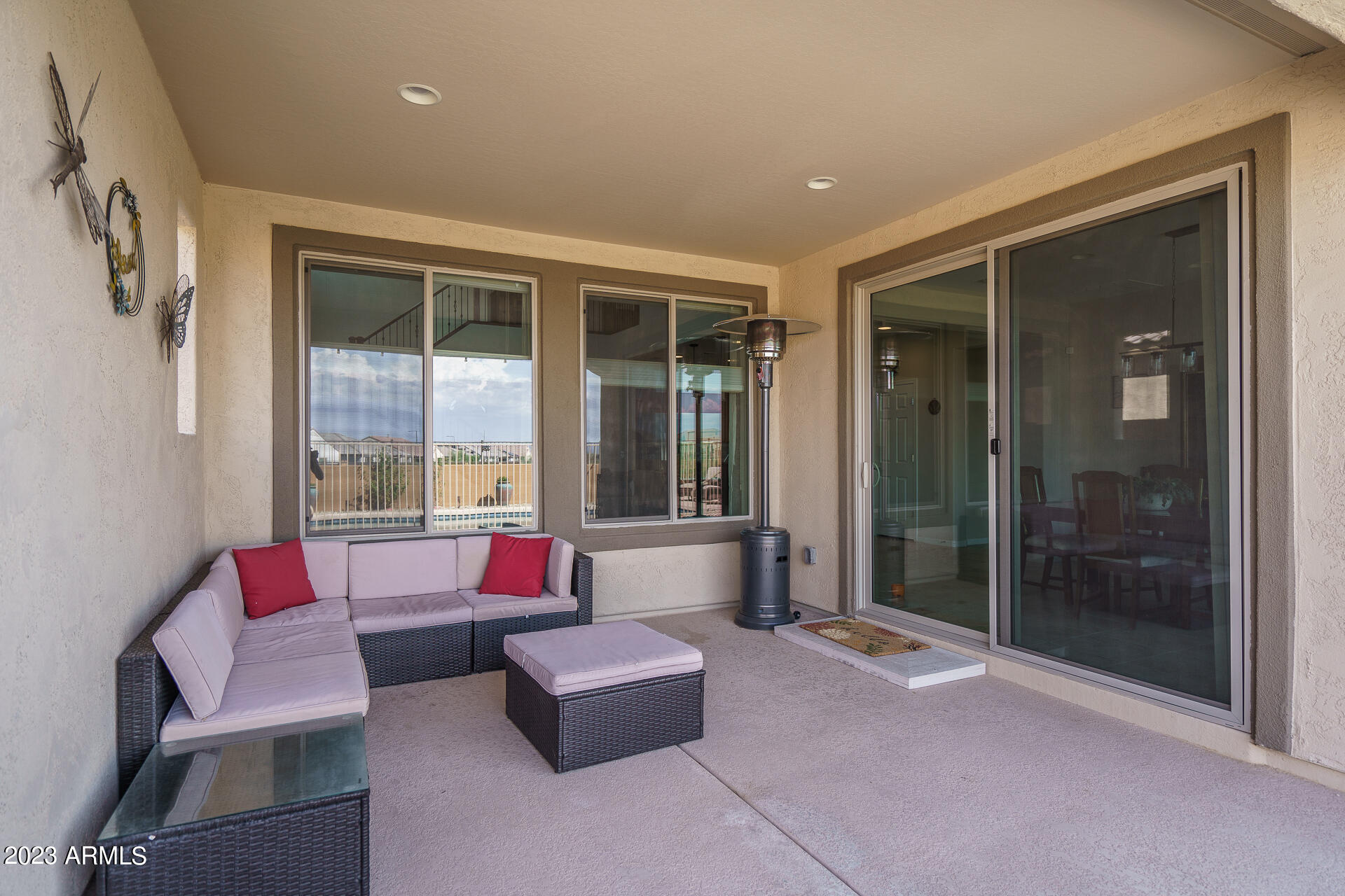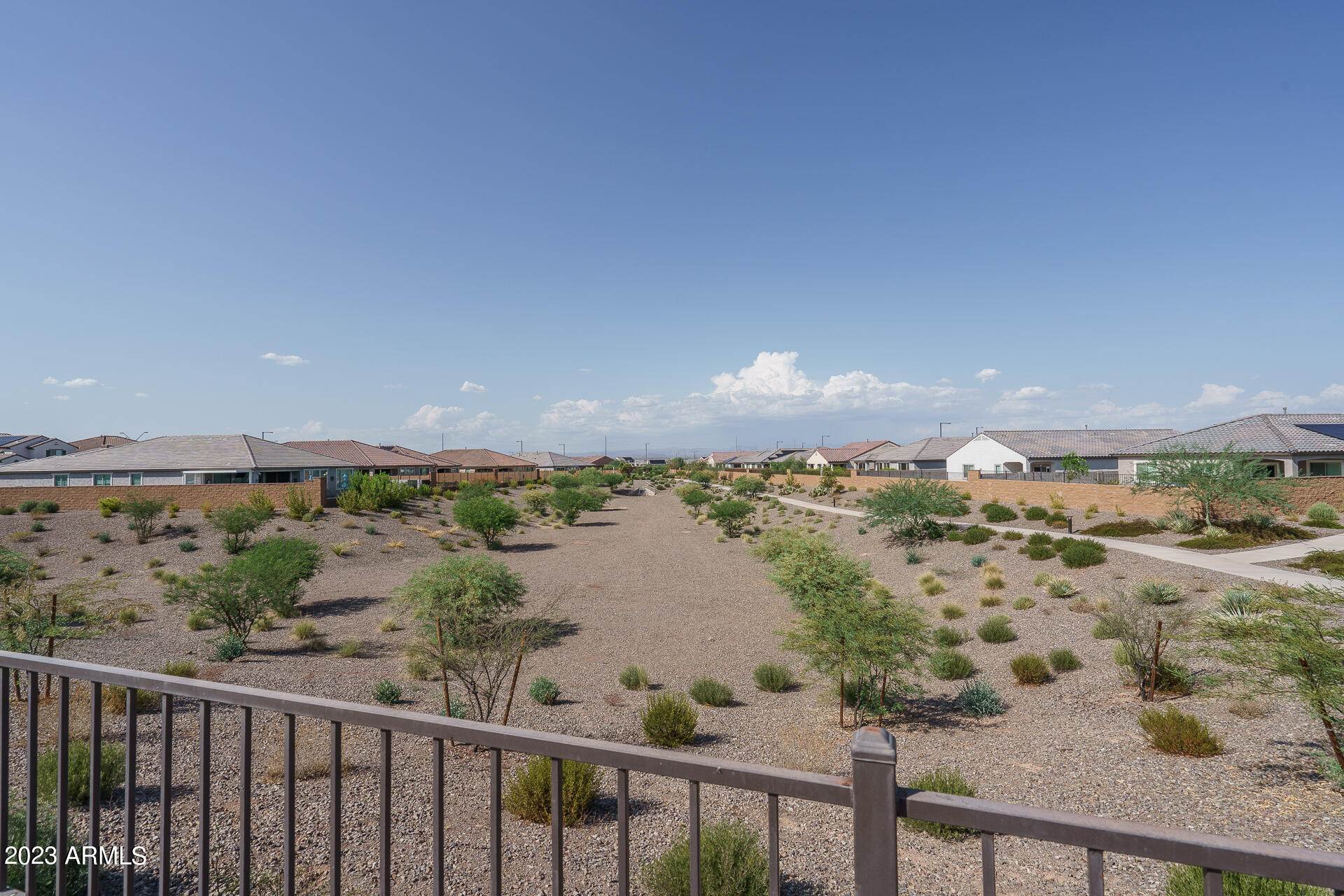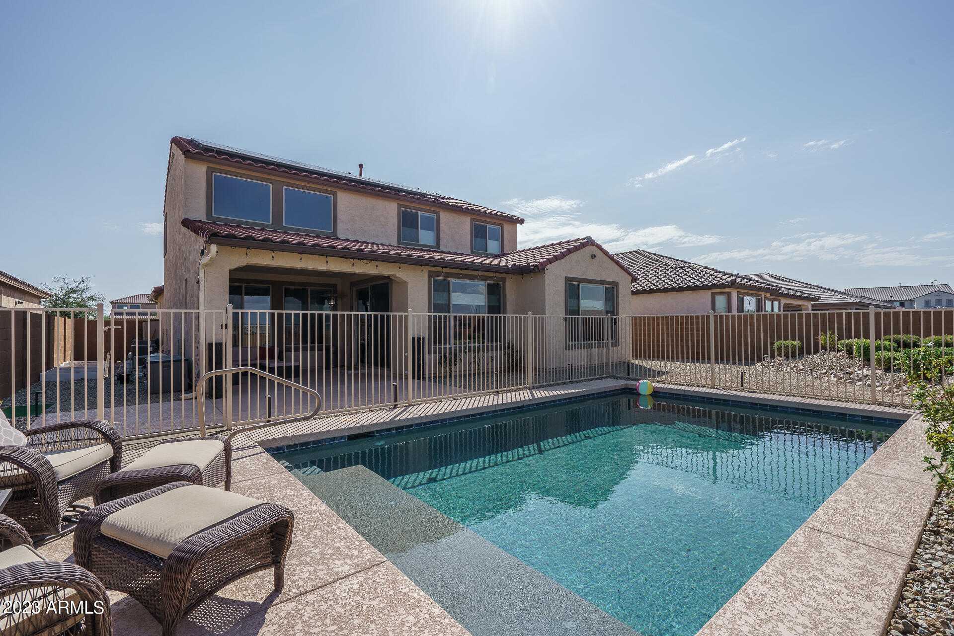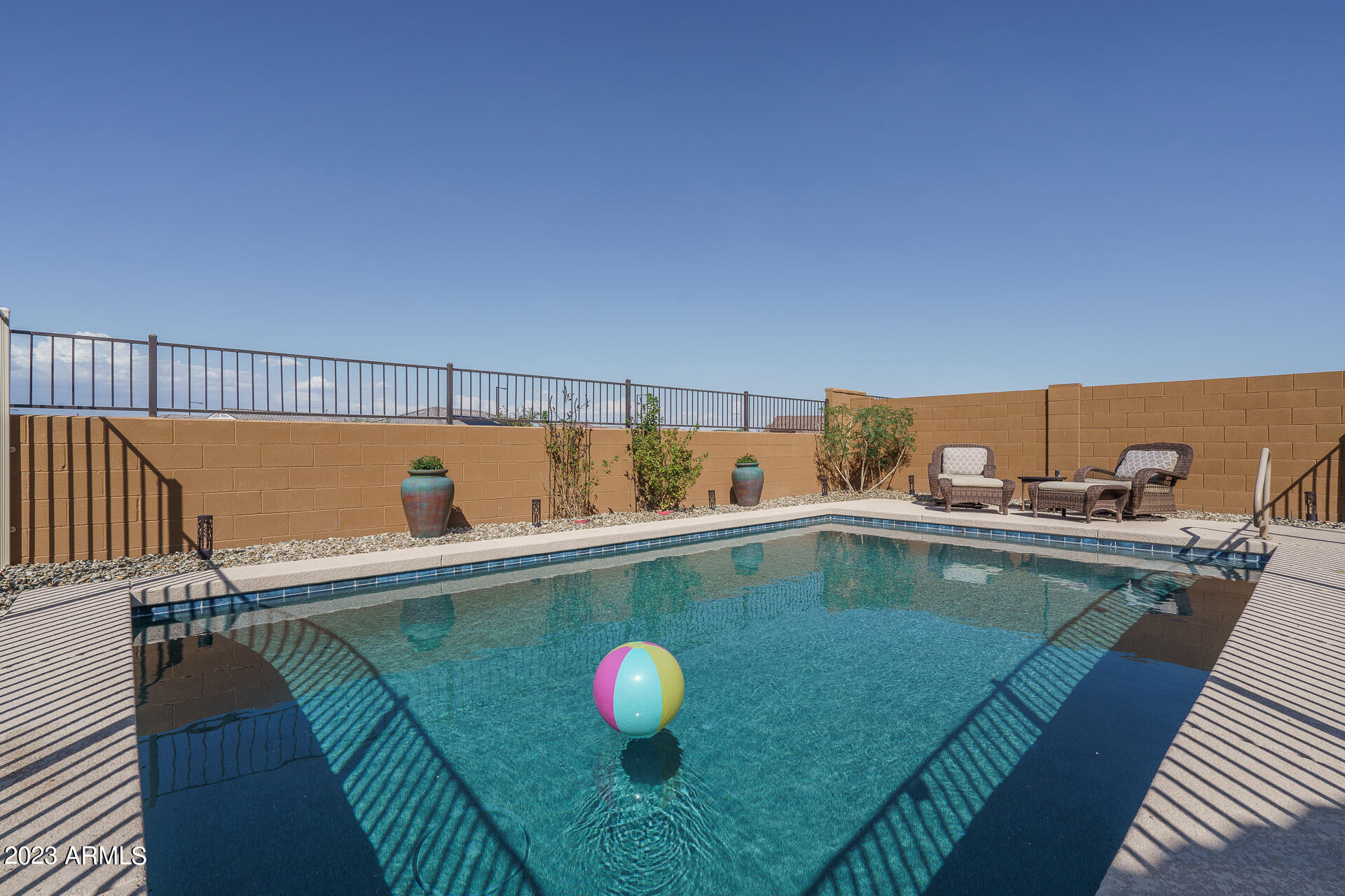 Welcome to this gorgeous Pulte home newly built in 2020 with a pool and no neighbors behind! The Prato is a desirable floor plan with dramatic ceilings, a 3-car tandem garage, a downstairs primary suite, and a gorgeous gourmet kitchen. As you enter the home you will notice a clean and inviting aesthetic throughout the entire home. The great room is spacious with tall ceilings, wood and iron stair railing, neutral wall tones, and a cozy electric fireplace. The kitchen is luxurious with a gas cooktop, stainless steel appliances, granite countertops, stylish tile backsplash, kitchen island with a breakfast bar and a walk-in pantry. Downstairs is the primary suite with a luxurious ensuite bathroom featuring a dual sink vanity, a big shower, and a walk-in closet. Upstairs is a loft with 3 remaining spotless bedrooms complete with neutral wall tones and ceiling fans. Bedroom 2 has an ensuite bathroom perfect for a guest room! The backyard is a private oasis with a view! Enjoy those AZ sunsets from the covered patio overlooking the sparkling pool! An entertainer's dream! Plus an R/O system and a water softner!