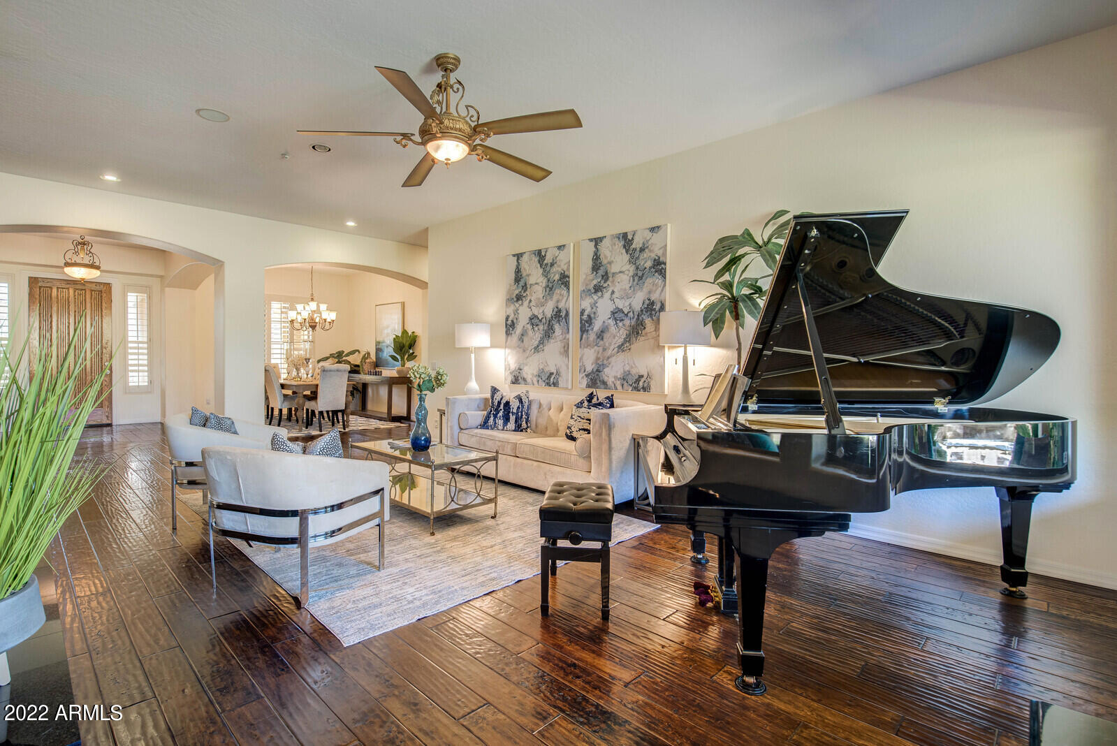 landscape & front patio fountain. Baja pool is elevated for privacy and has mountain views. Lush backyard has soothing waterfall wall, gorgeous rock formations. along with artificial grass & every variety of fruit tree. Home has a split floor plan with 4 bedrooms + office, 3.5 baths, Open great room concept with large kitchen island, under cabinet-storage and bar seating , Large picture windows throughout for loads of light. Living room has a gas fireplace & spacious open area to entertain. Home is a corner lot in a quiet cul-de-sac! There is a 3 car garage, RV gate & extra parking.