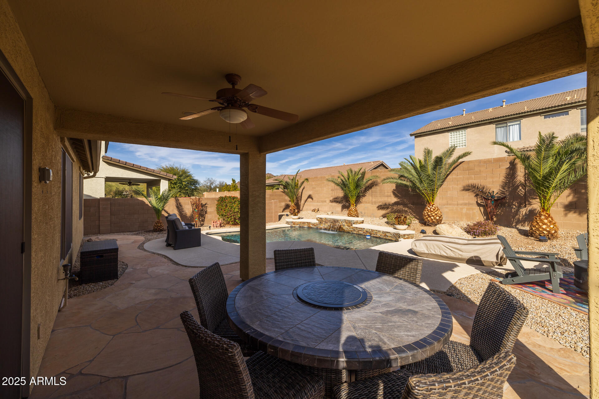 Located on a premium cul-de-sac homesite within a gated North Phoenix community, this well-maintained home offers 3 bedrooms + an office with double doors (easily a 4th bedroom) and 2 full baths in 1942 SqFt with an open great room layout and a teen room. The kitchen has an abundance of maple cabinetry with a built-in desk, stainless appliances, double door pantry, and an island with breakfast bar. Sliding doors lead out to a fabulous backyard where you'll enjoy a sparkling pool with stacked stone accents and water feature, covered patio with ceiling fan and flagstone-style floor, easy-care desert landscaping, and mountain views. The primary bedroom has crown molding and an en-suite bath with dual sink vanity, separate tub & shower, and walk-in closet. Other features include new exterior paint, plantation shutters throughout, tile and etched laminate wood floors (no carpet), surround sound ceiling speakers in the great room, additional ceiling speakers in the primary bedroom, office, and patio; crown molding in the office, laundry room cabinets, stone exterior elevation, and a 2-car garage.