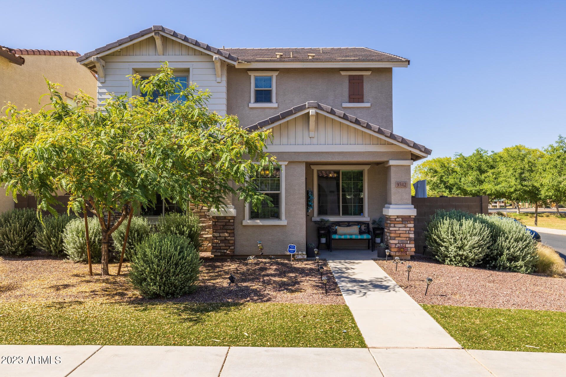 Amazing opportunity to own this 4-Bedroom+ den 3-bathroom home, with stunning mountain views from the patio! The den has double doors, perfect for an office! This well-thought-out floorplan has no wasted space! The kitchen is beautifully upgraded with 42'' Dark Espresso softclose cabinets, granite countertops, large island with breakfast bar, and a big walk-in pantry. The great room is open and has recessed canned lighting and a ceiling fan. The designer-style, light fixtures create a clean contemporary aesthetic, with neutral colors throughout the home. The primary suite is inviting with a luxurious ensuite bathroom boasting a walk-in shower, dual sink vanity, vanity desk with a place for a seat, and a giant walk-in closet! The remaining bedrooms are upstairs, complete with neutral color walls and ceiling fans. The laundry room is located upstairs for easy access! Through the double sliding doors off the great room, you will find an adorable private paved patio, to enjoy those gorgeous AZ sunsets! Additional features include Water softener, RO system, and Security system, and the property borders a community greenbelt and community pool. Dobbins Place is a serene community close to South Mountain boasting stunning views, a community pool, and a playground!